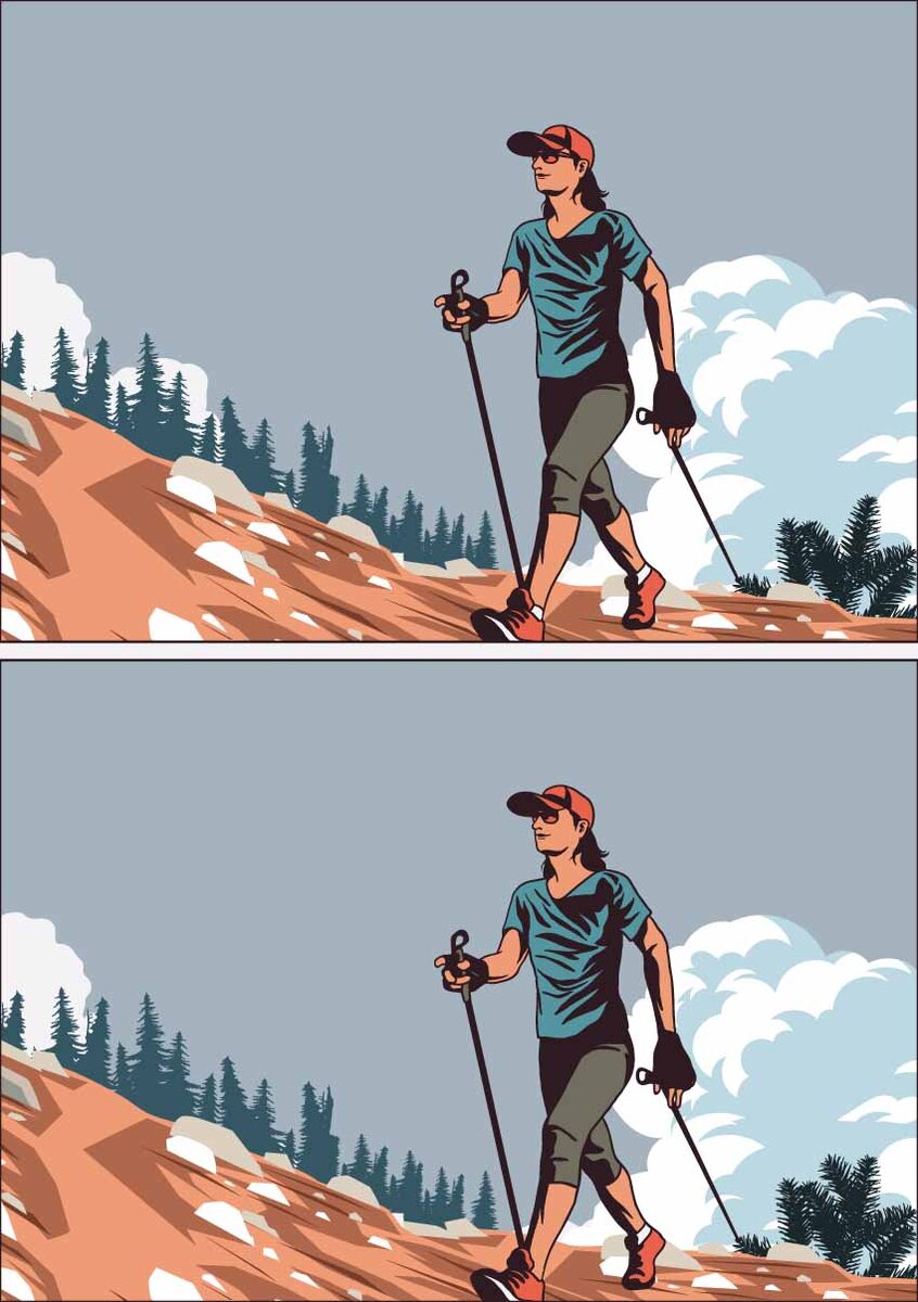 Заряжаемся позитивом, мечтаем о прогулках в горах и не даем мозгу заржаветь, ища отличия между этими замечательными рисунками. Художник постарался на славу, так что просто не будет. А потом, имея на то все основания, сможем похвастаться, что уделили время скандинавской ходьбе😉