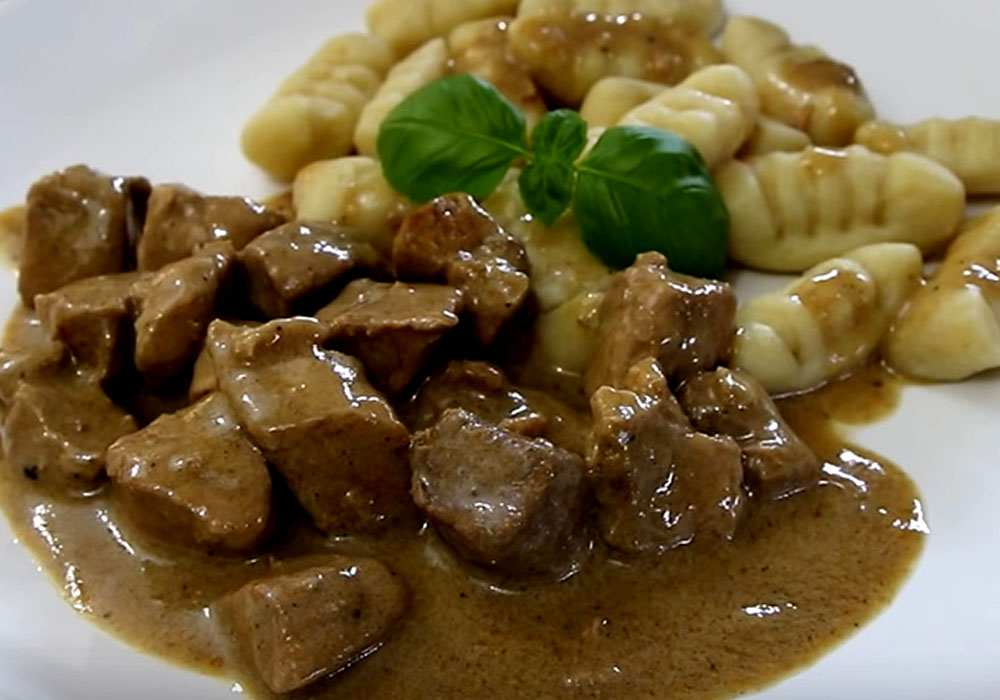 Далее добавьте в сковородку к мясу сливки. Сначала добавьте в сливки картофельную муку и тщательно перемешайте, чтобы не было комочков. Затем добавьте немного горячей жидкости из сковороды и быстро перемешайте. Теперь вылейте эту смесь в сковородку, быстро перемешивайте и кипятите, пока гуляш не загустеет.