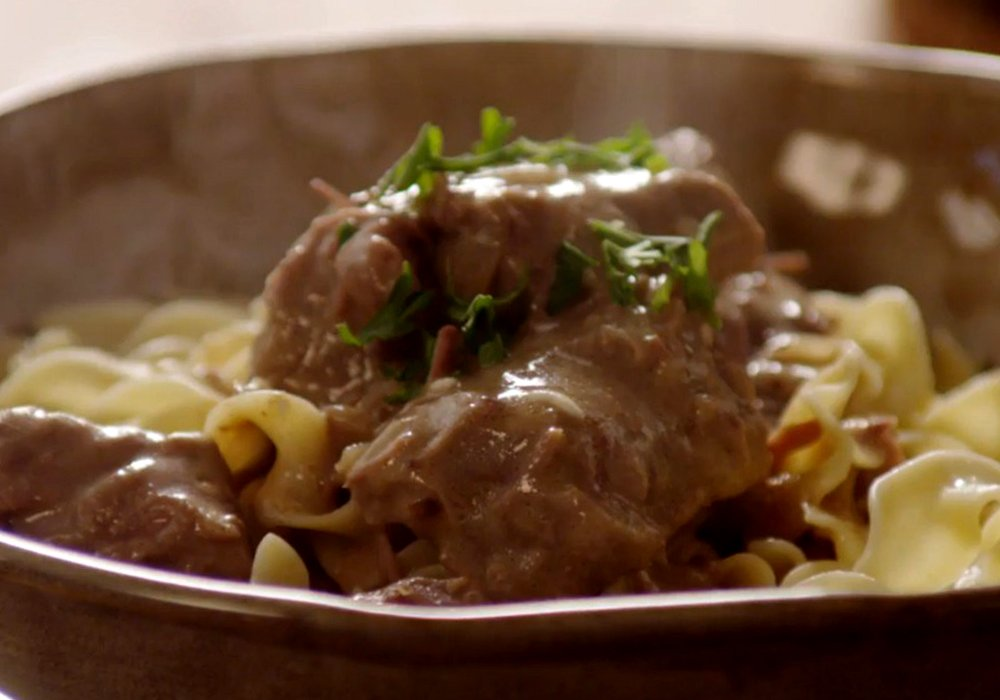 По истечении этого времени откройте крышку мультиварки и забросьте в чашу кусок сливочного сыра, хорошо перемешайте все до полного расплавления сырной массы и еще большего загустения. Готовый бефстроганов подавайте горячим, полив ранее отваренные макароны.