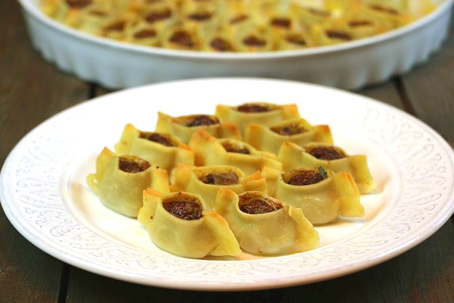 Отправляем форму в духовку, предварительно разогретую. На 15 минут при температуре 200 градусов. За это время манты немного запекутся. По прошествии времени вынимаем блюдо из духовки и заливаем туда кипяток. Так, чтобы манты были наполовину покрыты водой. И снова отправляем блюдо в духовку. Готовим, пока не выпарится вся вода (примерно 30 минут). Все, манты в духовке готовы!