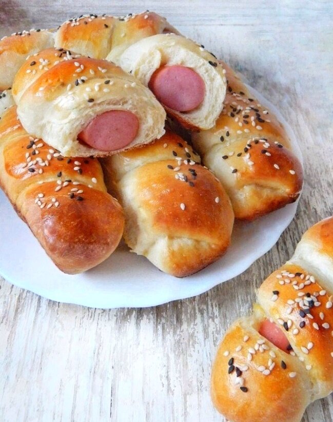 Дети и взрослые обожают булочки с сосиской к чаю ☕ Но в их качестве мы можем быть уверены, если приготовим их сами!🤗 Итак, поехали! Ингредиенты: 🔸️молоко тёплое - 250 мл 🔸️яйцо - 1 шт 🔸️сахар - 1 ст.ложка 🔸️сливочное масло - 50 гр 🔸️дрожжи сухие - 10 гр 🔸️мука - 500 гр 🔸️соль 1 ч.л. 🔸️сосики - 16 шт 🔸️тёртый 🧀 или кунжут для посыпки изделия В теплом молочке растворяем сахар и дрожжи. Оставляем на 7 минут. Добавляем яйцо, соль, просеиваем муку. Выкладываем тесто на стол и добавляем сливочное масло. Тесто кладём в большую миску, накрываем полотенцем. Убираем в тёплое место, оно должно увеличиться примерно в 2 раза! Обминаем тесто и делим его на 16 равных частей. Складываем каждый кусочек в колбаску (она должна быть длиннее сосиски в 1,5-2 раза). Расплющиваем скалкой каждую колабску и оборачиваем сосиску. Выкладываем сосисточки в тесте на противень, смазанный маслом и оставляем на 20 минут. Смазываем яйцом, чтобы булочки были румяными. Посыпаем кунжутом или сыром. Выпекать пр