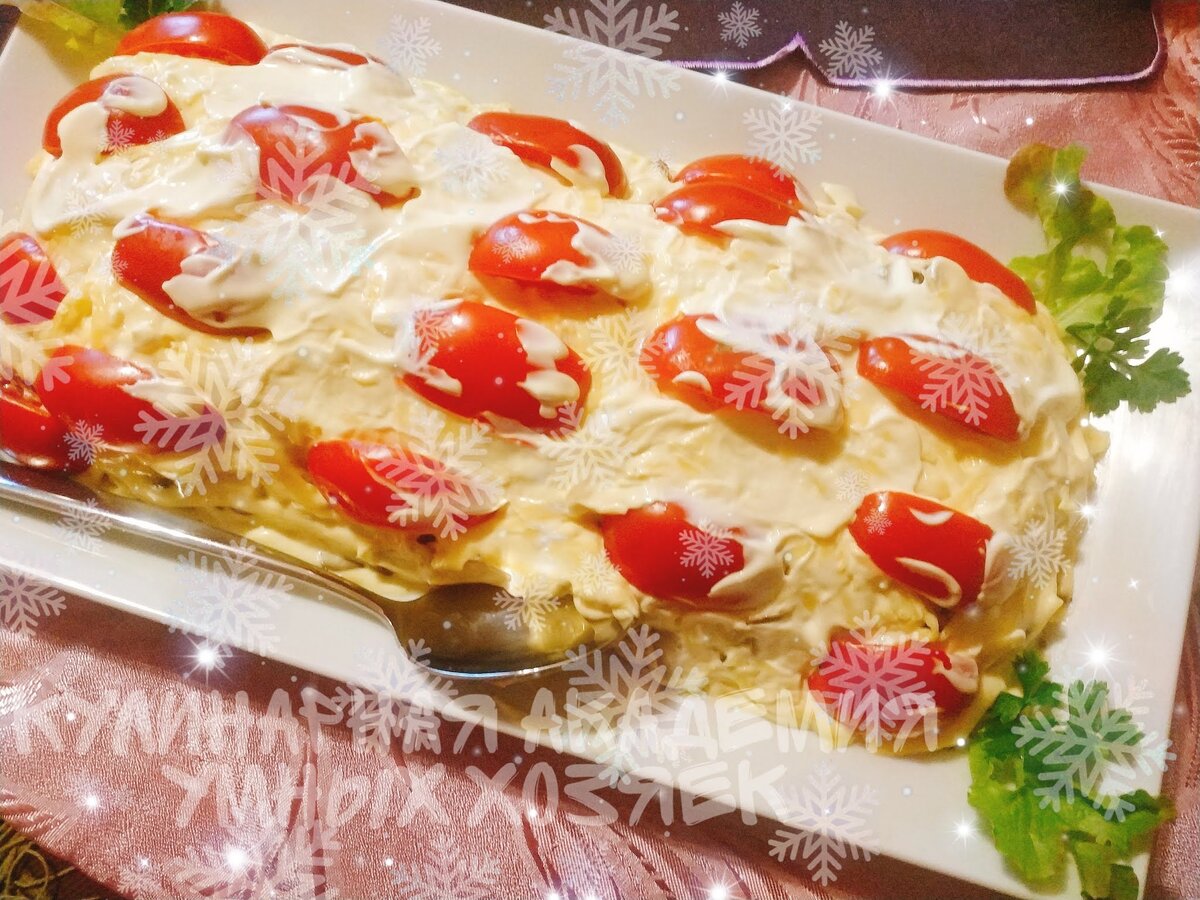 Слоёный салат с курицей и жареными грибами «Купеческий дворик»