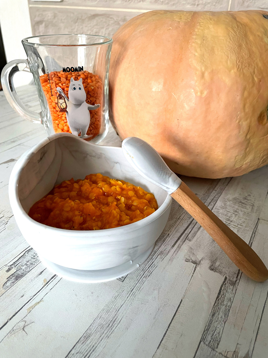 Не знаете чем накормить своего маленького привереду, который на гарнир кушает только макароны? Разнообразьте рацион своего малыша вкусным и полезным гарниром. Рецепт очень простой и быстрый. Нам понадобиться: Тыква - 1 шт( можно взять готовое тыквенное пюре 200гр) Красная чечевица - 200гр Соль- по вкусу( с 2-х лет) Паприка( лучше копчёная) - по вкусу Приготовление: Делаем пюре из тыквы. Разрезаем тыкву на 2 части, чистим от косточек. Кладём половинки тыквы на противень, добавляя пол стакана воды. Запекаем при 180С 30-40 мин. Достаём мякоть ложкой, отделяя от кожуры. Остатки мякоти, можно заморозить. В следующий раз можно будет просто достать уже готовое пюре. Далее. Промываем чечевицу. Добавляем воды( на 2 см выше крупы) и тыквенное пюре. Варим около 15 мин. Добавляем соль и паприку по вкусу. Подаем нашему малышу и любуемся, как он кушает. Приятного аппетита!
