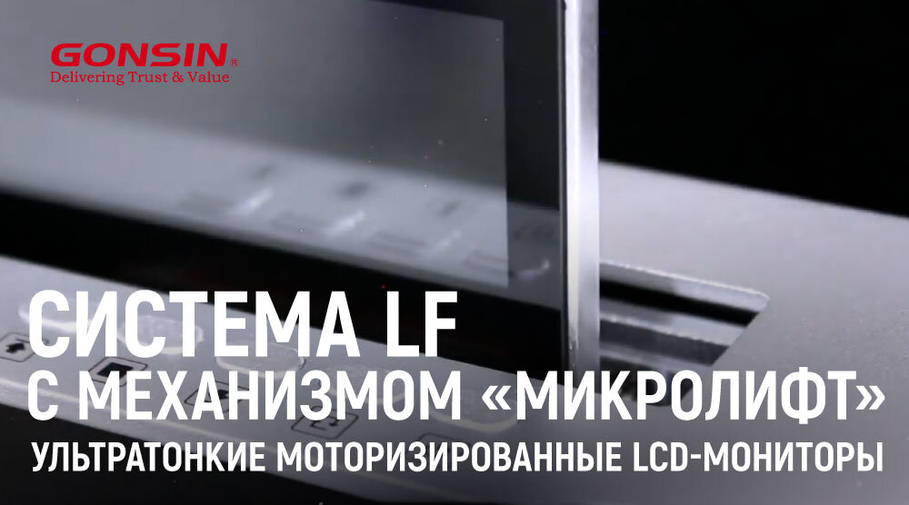 Интегрированная система с использованием механизма микролифта. Имеет возможность независимого управления экраном и микрофоном. Элегантное и строгое исполнение подходит для помещений с повышенными требованиями к дизайну интерьера. Данная система включает в себя оборудование с возможностью использования механизма «микролифт» для мониторов и микрофонов. Предназначена для работы в различных комплексах отображения информации, конференц-системах. Система LF состоит из трех основных компонентов: модуль монитора, совмещенный модуль монитора и микрофона, модуль микрофона. Диагональ модулей мониторов – от 15 до 23 дюймов, угол наклона – 0~30°, видеовход - HDMI+VGA. Есть модификации со вторым экраном для вывода дополнительной информации. При использовании в составе цифровой мультимедийной конгресс-системы основной монитор поддерживает TouchScreen. Интегрированная лифтовая система имеет возможность независимого управления экраном и микрофоном - управление осуществляется с помощью кнопок на панели