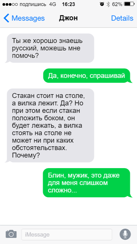 Русский язык хоть и не входит в пятерку самых сложных языков мира (как тот же китайский или арабский), но трудностей при его изучении возникает множество. Особенно у иностранцев, которые пытаются выучить русский. Одни только омонимы могут поставить в тупик. Омонимы - одинаковые по написанию и звучанию, но разные по значению слова. Пример: за́мок и замо́к. Представляю вашему внимаю подборку переписок с иностранцем, который пытается разобраться в некоторых трудностях языка. Джона можно понять, ведь не все смогут объяснить эту логику (филологи не в счет). Даже носители языка не всегда могут ответить на такие хитрые вопросы. Роберту повезло, что попался человек, обладающий такой информацией! Иногда как вылетит нужное слово из головы... И хоть весь расстарайся, не вспомнишь... Имена с их краткими формами и правда бывают как забавными, так и не очень понятными. Но главное, чтобы самому человеку нравилось. Даже если он Иннокентий, а близкие зовут его ласково Кешей. Так и надо! Если не знаешь