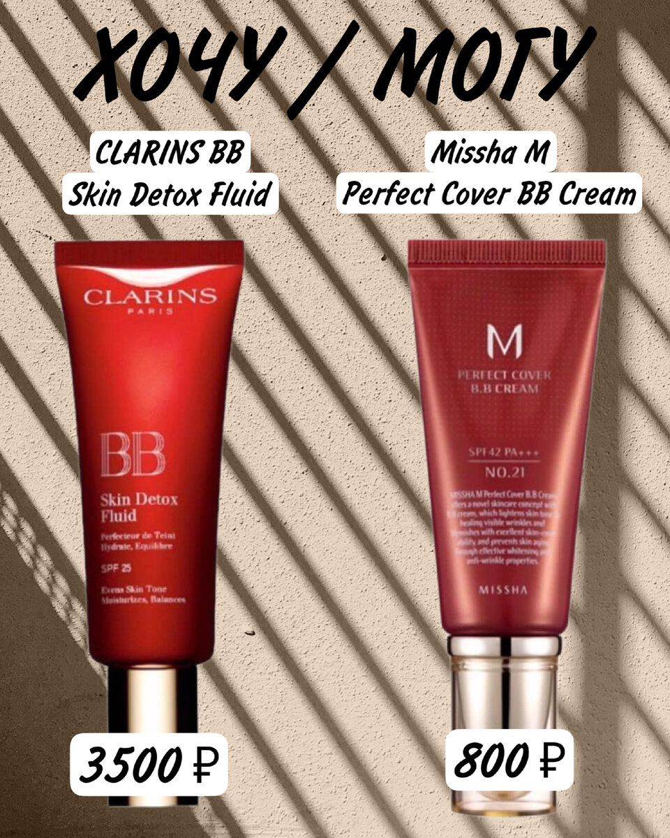 ⭐CLARINS BB Skin Detox Fluid ✨ легкий тон ✨легко распределяется и впитывается ✨Придает коже легкое естественное сияние ✨перекрывает небольшие недостатки Цена💸3500₽ . ⭐Missha M Perfect Cover BB Cream ✨придаёт коже равномерное покрытие ✨ перекрывает небольшие недостатки ✨придаёт коже сатиновый финиш ✨Хорошо подстраивается под тон кожи Цена💸800₽
