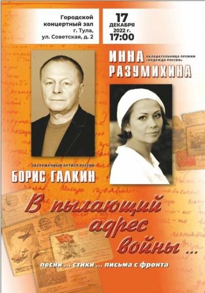 В Городском концертном зале города Тулы при поддержке депутата Государственной Думы Виктора Дзюбы, генерального директора завода «Мехмаш», депутата Тульской городской Думы Александра Швыкова и первого заместителя генерального директора завода «Мехмаш», депутата Тульской областной Думы Дмитрия Афоничева 17 декабря 2022 года в 17 часов пройдет благотворительный патриотический концерт заслуженного артиста Российской Федерации, режиссера, сценариста и композитора Бориса Галкина и российской эстрадной певицы, многократного лауреата конкурсов артистов эстрады Инны Разумихиной. Организация и проведение мероприятия осуществляется за счет личных средств Виктора Дзюбы, Александра Швыкова и Дмитрия Афоничева. Председатель Тульской областной Думы Николай Воробьев откроет благотворительный концерт. Билеты переданы жителям Тулы, сотрудникам правительства Тульской области, силовых структур региона и Тульской областной Думы на безвозмездной основе. 16+
