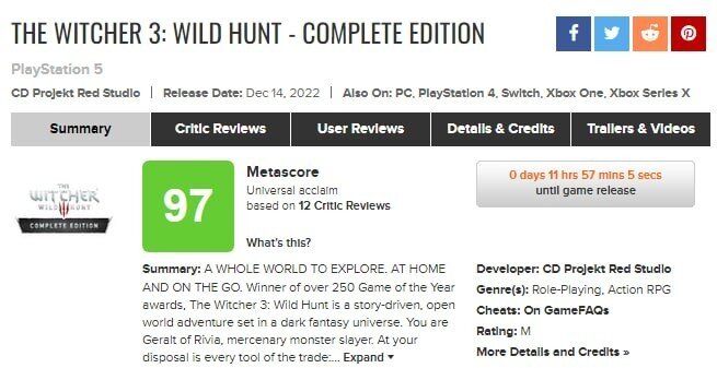 Перед релизом некстген-патча для The Witcher 3, который состоится 14 декабря 2022 года, игровые издания опубликовали рецензии на обновленную версию проекта. Оценки обновленной версии The Witcher 3 Критики остались в восторге от ремастера «Ведьмака 3» — ролевая игра получила 97 баллов на Metacritic на основе 12 обзоров. У оригинального проекта — 93 балла. Оценки некстген-версии The Witcher 3 Рецензенты отметили, что новый «Ведьмак 3» кардинально не отличается от оригинальной игры, изменения коснулись, в основном графических и визуальных аспектов вроде детализации объектов или освещения. Поскольку все нововведения были добавлены в рамках одного патча, то The Witcher 3 действительно можно считать обновленной. Обозреватели придрались только к производительности игры на PS5. Порой в режиме «качество» случались большие просадки частоты кадров, поэтому, как считают критики, его лучше использовать для создания эффектных скриншотов. «Ведьмак 3: Дикая Охота — Полное издание» так же актуальна сей