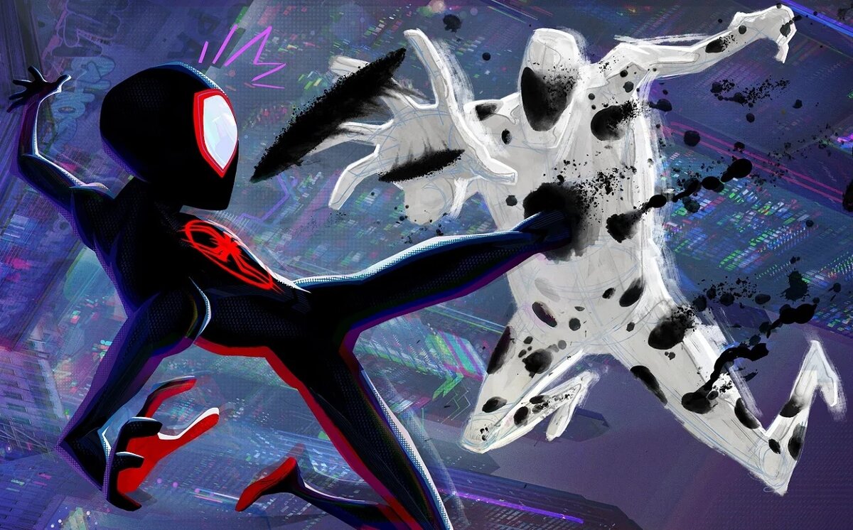 Один из режиссёров анимационного фильма «Человек-паук: Через вселенные 2» (Spider-Man: Across the Spider-Verse) Кемп Пауэрс в разговоре с изданием Total Film подтвердил, что персонаж Пятно станет главным антагонистом не только второй части, но и третьей. Озвучивает героя актёр Джейсон Шварцман («Отель „Гранд Будапешт“»). Ранее появлялась информация, что Пятно станет злодеем сиквела. «Если вы присмотритесь к его способностям, то увидите невероятный потенциал. Он может открывать порталы между измерениями и идеально подходит для „Паучьей вселенной“. Он станет злодеем в следующих двух фильмах… И давайте просто скажу, что истории Пятна и Майлза будут связаны в неожиданном ключе», — рассказал Пауэрс. В оригинальных комиксах Пятно (или же Джонатан Онн) был учёным, который работал на Уилсон Фиска. Пятном он стал случайно, в ходе неудачного эксперимента. Его способности позволяют создавать червоточины, с помощью которых он может атаковать с любого расстояния — или и вовсе перенаправлять вражеск