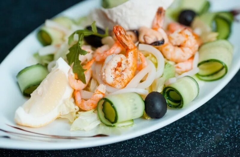 Салат простой, на приготовление уйдёт буквально 5 минут, а по вкусу придётся абсолютно всем 🔥 Это я вам гарантирую, проверено на своих 👍 Список ингредиентов: - крабовые палочки - 1 упаковка, 200 грамм - креветки в рассоле - 1 упаковка, 200 грамм - кальмары в рассоле - 1 упаковка, 200 грамм - огурец - 1 крупный или 2 средних - яйца куриные - 3 штуки - твёрдый сыр - 100 грамм - чеснок - 1 зубчик - майонез - для заправки - оливки, икра, дольки лимона, зелень - для подачи и сервировки по желанию Способ приготовления: 1. Крабовые палочки, огурцы, яйца нарезать кубиками или соломкой. 2. Кальмары и креветки так же можно нарезать или оставить в таком виде, в котором они были в рассоле. 3. Сыр и чеснок измельчить на терке. 4. Салат возможно готовить слоями или же просто смешать все ингредиенты. 5. Если выбран первый вариант, то укладываем слои: крабовые палочки - кальмары - огурцы - креветки - сыр с чесноком - яйца, все слои промазать майонезом. Украсить по желанию икрой. 6. Если
