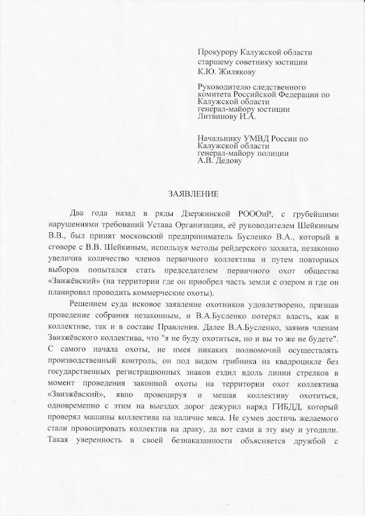 К вышеперечисленному стоит добавить, что в производстве районной полиции находятся пять уголовных дел по фактам браконьерских охот и рыбалок, конечные результаты которых до сих пор не вынесены. Сюда можно прибавить проведение Конференции 29. 05. 2021 года, на которой был избран председателем РОООиР Шейкин В.В. И куда не пускал принять законное участие в голосовании охотников Бусленко В.В., рядом с которым находились сотрудники полиции Козлов Д.С. и Ключников В.С.