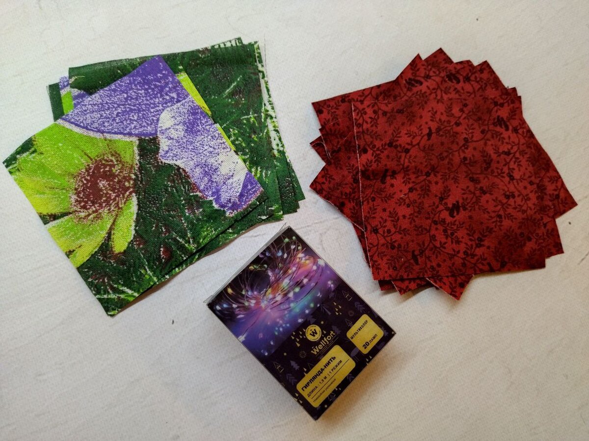 Когда у меня появляется идея сшить что-то новое, обычно начало идёт из какого-то кусочка ткани, его фактуры, рисунка и прочее. Но не в этом случае. Находясь в магазине, несколько раз брала эту маленькую коробочку с гирляндой в руки, вертела и ставила обратно на полку. В итоге все-таки купила, потому что идея пробилась-таки сквозь слой загруженной реальности. Я четко увидела, в какой именно работе хочу применить этот новогодний декор. Скорый волшебный праздник очень радушно принимает любое рукоделие. Перебора точно не будет. Тут и яркие дорожки на стол, салфетки, подушки, прихватки, мешки для подарков, различные декоры – список просто бесконечный! Все найдет себе применение или в виде украшения дома или как приятный подарок родным и близким. Я же захотела сделать подобие рождественского венка. Объемного, красочного и обязательно немного волшебного. И тут как раз гирлянда пригодилась как нельзя кстати! Ткани для работы можно брать любые. Главное, чтобы вам было комфортно работать с ними