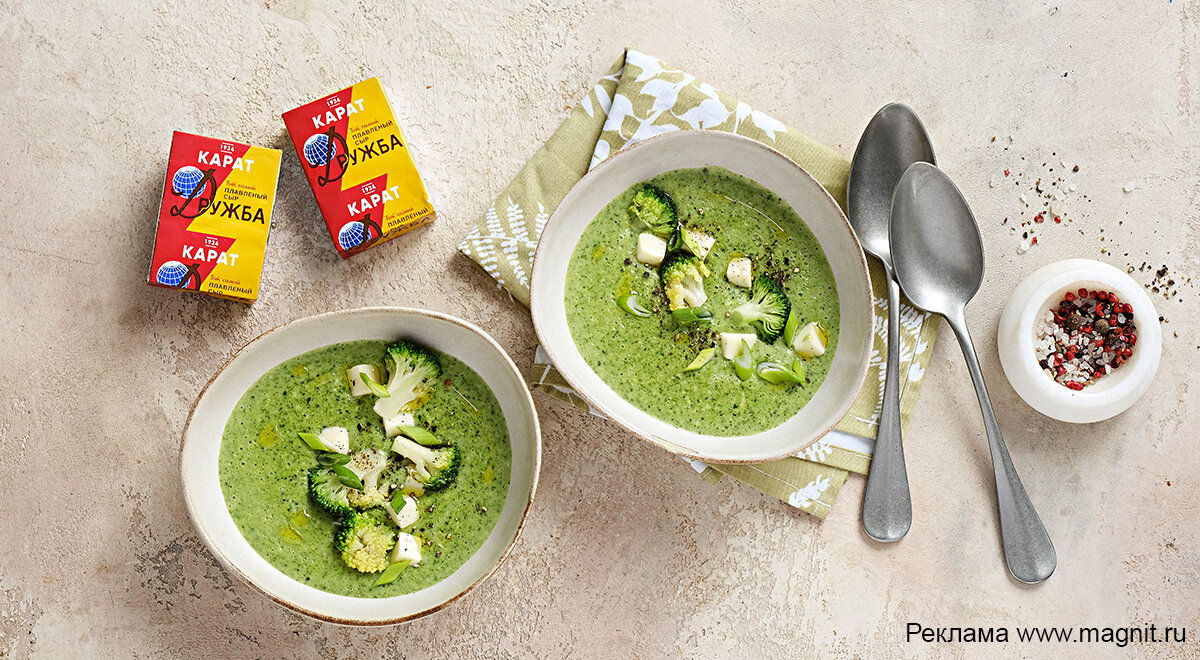 🥦 ИНГРЕДИЕНТЫ: 600 г брокколи 180 г плавленого сыра Дружба «Карат» 40 г сливочного масла 2 луковицы 6 зубчиков чеснока соль свежемолотый чёрный перец зелёный лук для подачи ПОШАГОВОЕ ПРИГОТОВЛЕНИЕ ⬇️ Шаг 1. Лук нарежьте полукольцами, чеснок измельчите. Шаг 2. Разогрейте сковороду со сливочным маслом, добавьте лук и готовьте 4–5 мин, до прозрачности. Добавьте чеснок и прогрейте 30 сек. Шаг 3. В кастрюле вскипятите 1,2 л воды. Добавьте брокколи и готовьте 2–3 мин. В кастрюлю выложите лук и готовьте ещё 3–4 мин. Приправьте солью и перцем. Добавьте 150 г плавленого сыра. Шаг 4. Пробейте суп блендером до однородной консистенции и верните на огонь. Шаг 5. Подавайте горячим, украсив зелёным луком и кусочками сыра. Время готовки - 20 мин Количество порций - 4 Количество калорий - 281,5 ккал БЖУ: 12,6 г / 19,9 г / 16,2 г Реклама. АО "Тандер". https://magnit.ru