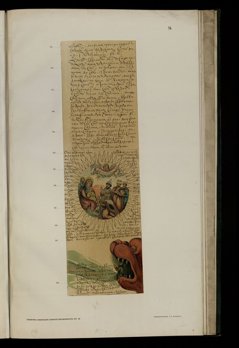 Собственно, до "Великого" было ещё очень далеко. Да и не совсем портрет это - ведь художник никогда не видел свою модель. А было это в 1672 году. Подъячий Григорий Всполохов, служивший в Ямском приказе, был обвинен в растрате. В его обязанности входила выдача жалования ямщикам, но при проверке он не смог отчитаться о семи тысячах рублей. Пытаясь оправдаться, он обратился с челобитной к царю Алексею Михайловичу, но ответа не получил. Тогда он подготовил вторую челобитную, надеясь в этот раз на снисхождение в связи с большой радостью в царской семье - рождением сына Петра. Этот живописный и каллиграфический шедевр, как считают исследователи, был написан самим Григорием Всполоховым. Длина свитка - 16 метров. На одной из пяти иллюстраций изображен Алексей Михайлович с новорожденным сыном на руках.