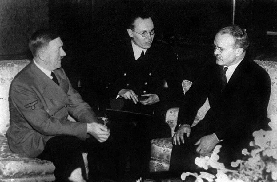 Визит народного комиссара иностранных дел СССР Вячеслава Молотова в Берлин в ноябре 1940 года, конечно, ещё больше обострил в советских людях сознание грозящей со стороны фашистской Германии опасности. Хотя Молотов (дважды встречавшийся с Гитлером) говорил с ним главным образом о том, что беспокоило Советский Союз больше всего, - о проникновении гитлеровской Германии в Румынию и на Балканы, об отправке германских войск в соседнюю Финляндию и пр. - Гитлер в ответ делал ему нелепые предложения насчёт присоединения Советского Союза к "тройственному пакту" Германии, Италии и Японии, чтобы СССР мог потом принять участие в разделе Британской империи и распространить сферу своего влияния в направлении Персидского залива и Индийского океана. На фото: встреча Вячеслава Молотова с Адольфом Гитлером в Берлине. Ноябрь 1940 года. По поводу Британской империи Гитлер не шутил с Молотовым. Вот что он говорил в кругу своих друзей промышленников: " Я всё продумал: мы поможем повстанцам в Иране и в Ир
