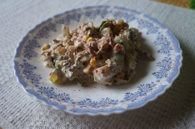 На днях, покупая продукты в магазине, вспомнила, что однажды мы с ребенком готовили потрясающий салат из тунца. С китайской капустой. Банка тунца точно была дома. Так что дело оставалось за малым - купить эту самую капусту, что мы и сделали. Придя домой сразу же взялись за приготовление. При том, что рецепты я всегда все сохраняю, в этот раз почему-то решила посмотреть его не в своих записях, а в интернете. Найдя, как мне показалось, тот самый рецепт мы взялись за дело. Готовый салат можно на выбор заправить либо растительным маслом, либо майонезом. С майонезом оказалось вкуснее. Сидим, едим и вдруг Ульяшка меня спрашивает: "Мама, а это точно ТОТ рецепт? Там кажется была другая заправка?". Пришлось залезать в свои записи. И точно... А рецепт-то был другим. Но салат все равно получился вкусным и полезным. Итак. Нам понадобится: Листья промыть и порезать полосочками. Я взяла 6 листиков. Тунец размять вилкой или ножом. Положить и то и другое в салатницу. Добавить порезанный соломкой