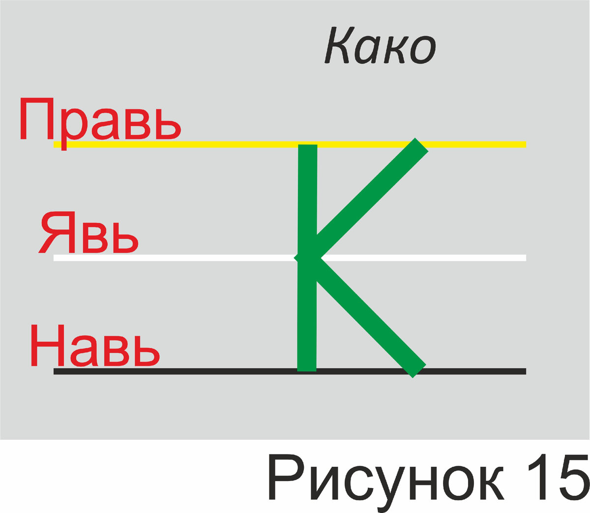 Буквица «КАКО» изображается на буквенном стане (рисунок 15) в виде вертикальной полосы «ижеи» - живого духа и стрелки, указывающей в месте пересечения этой вертикали с линией яви. Эта стрел как бы указывает нам: «кто есть этот «ижеи» в настоящий момент». Все вопросы, относящиеся к живому, начинаются с этой буквы: кто, как, какой, куда, каким образом. Расположение стрелки именно справа как бы отсыл из будущего, из того, что еще не написано в строке, на этого «ижея». Поскольку рассмотрение мира вокруг нас мы рассматриваем относительно человека. Как и каким образом может быть полезно или опасно для жизни. Эта буквица имела числовое значение 20. Слоги с этой согласной имеют математический и технический смысл в смыслах описания объема, системы, подобия и союза.