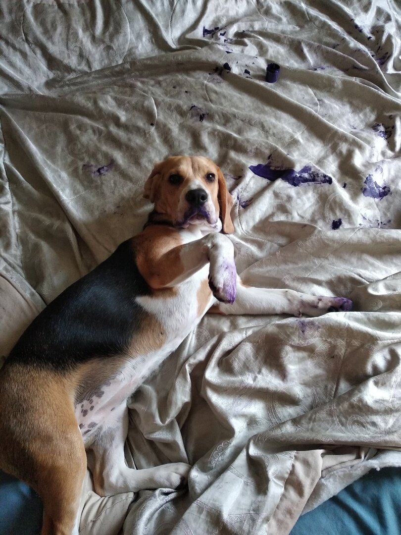 Бигль - очень симпатичная Божья тварь. Ну прям милашечка. И надо отдать должное , весьма чистоплотная. Уж не знаю ,как им это удается, но грязь от бигля отлетает весьма быстро. Шерстка всегда чистая и блестящая, особо не линяет. Но это явление от природы и совсем не относится к самой натуре бигля. Все меняется ,когда бигля что-то задумает . И упаси Боже, творческая идея сузится до уровня акриловых красок или, того хуже , краски для заправки печатей. Тогда Ваша жизнь никогда не будет прежней. Нет , я, конечно, предполагала , что старое покрывало сыграет в моей жизни какую-то роль .Оказывается, не надо выбрасывать из дома старые покрывала , пока в доме бигли. Ну не надо . Пригодится. Кровать спасете. Бигли только на них живут и творят. Плюсы : теперь я знаю ,какой вкус у краски и чем отмывать ее от лап. Вкус вкусный, не отрава. Значит это безопасно для семьи. Минусы: твою ж дивизию ,как отмывать морду? Головоломка. Собака должна спокойно себя чувствовать и дома, и на ул