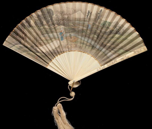 Японский веер периода Мэйдзи из слоновой кости и шелка, расписанного изображением фигур, гуляющих на берегу реки перед горой Фудзи и птицей на цветущей ветке.
