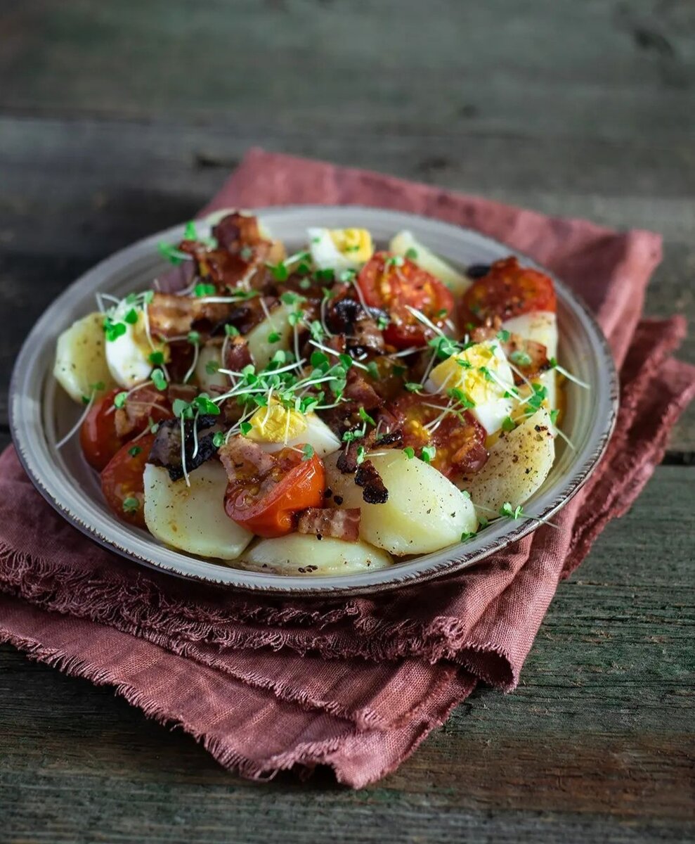 Привет, друзья ! Сегодня у меня для вас рецепт вкусного и простого картофельного салата с беконом . ИНГРЕДИЕНТЫ : Картофель - 400 г, Растительное масло - 4 столовые ложки, Уксус бальзамический - 2 столовые ложки, Дижонская горчица - 1 чайная ложка, Помидоры черри - 200 г, Бекон - 80 - 100 г, Яйца варёные - 2 штуки, Соль, перец - по вкусу, Зелень - для подачи . ПРИГОТОВЛЕНИЕ : 1) Картофель очистить, нарезать средним кубиком, отварить в подсоленной воде до полуготовности . Воду сливаем . 2) Смешиваем растительное масло, дижонскую горчицу, уксус, соль и перец . 3) Черри режем пополам . Картофель и помидоры кладём в форму для выпечки и сбрызгиваем половиной заправки . Запекаем 15 минут в разогретой до 180 градусов . 4) Бекон нарезаем кусочками и обжариваем на сухой сковороде . Яйца режем на четвертинки . 5) В салатнике соединяем все ингредиенты, поливаем заправкой . При подаче посыпаем зеленью . Приятного аппетита !