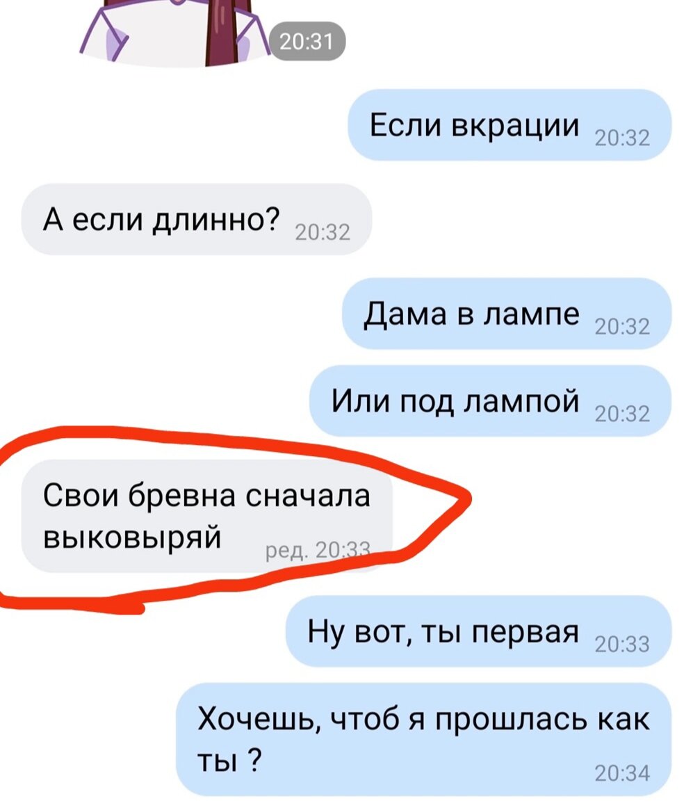 А она снова мне вслед орет: "Бревна выковыряй свои, это я тебе как дюдюка говорю и ножом в меня своим тычет и лампу на башке поправляет.
