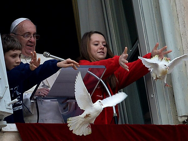 После этого великолепного пожелания вместе с двумя детьми понтифик выпустил в небо двух белых голубей, символизирующих стремление к обретению мира. И вдруг появились ворона и чайка, которые напали на голубей...