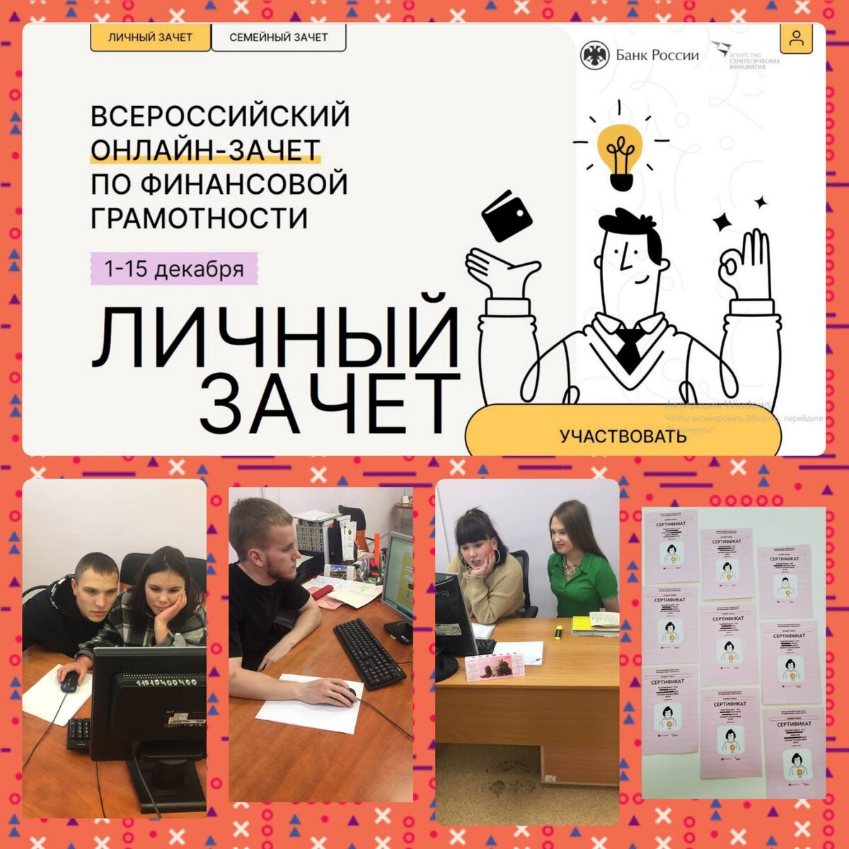 Ежегодно проходит Всероссийский онлайн-зачет по финансовой грамотности. Мероприятие организует Банк России совместно с Агентством стратегических инициатив. Цель мероприятия – повышение финансовой грамотности россиян. Участники зачета отвечают на вопросы о вкладах, кредитах и платежных картах, других финансовых продуктах и услугах, о том, как распознать мошеннические схемы. Мероприятие предназначено для того, чтобы проверить, насколько хорошо он ориентируется в финансовых вопросах. Такая возможность выпала и нашим выпускникам. За успешное прохождение зачёта каждый выпускник получил именной сертификат.
