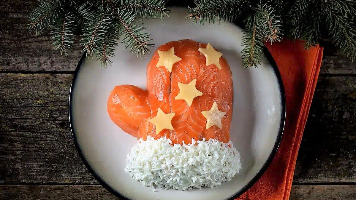 Отличный новогодний салат поражает своим оригинальным видом и невероятно нежным сочетанием ингредиентов. Идеально подходит для новогодних праздников. Ингредиенты ниже, в комментариях. Время приготовления: 60 мин. Пошаговый рецепт: Варежка Деда Мороза - Вкусный салат на Новый Год: ШАГ 1: Отварите рис. Яйца отварите вкрутую в течение 10 минут, дайте им остыть и очистите. ШАГ 2: Крабовые палочки и яйца натрите на крупной терке. Отложите часть яичного белка для украшения. ШАГ 3: Огурец очистите и нарежьте небольшими кусочками. Смешайте рис с небольшим количеством майонеза. ШАГ 4: Выложите салат на салатницу в форме варежки. ШАГ 5: Сначала выложите рис, затем огурцы, крабовые палочки и яйца. Наносите сеточку майонеза после каждого слоя. ШАГ 6: Поверх салата выложите тонко нарезанный лосось. Сверху добавьте яичный белок, который вы отложили и украсьте салат сырными звездочками. Приятного аппетита и прекрасного настроения! Друзья, ставьте лайк👍 и подписывайтесь на канал😍, чтобы не пропусти