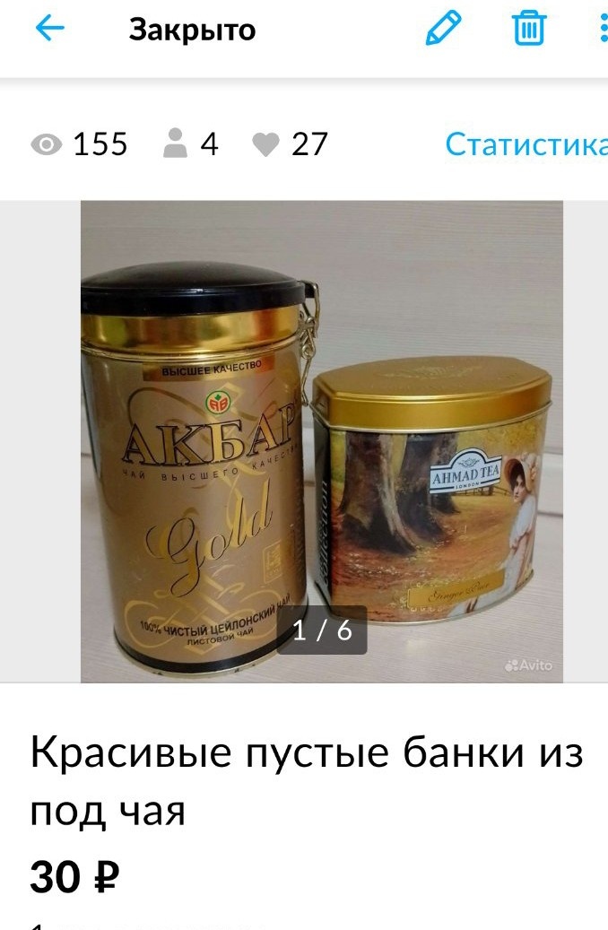 Всем добрый день🤗!!! Часто просматриваю разные объявления на Авито. Удивляюсь тому, что только люди не продают😁. И я решила попробовать выложить какую-нибудь ненужную ерунду. Оказывается, их у меня предостаточно. И выкинуть жалко, и лежат без дела. *Банки из под чая. Мне дарили когда то давно чай в таких баночках. Можно хранить в них так же чай рассыпной или все что угодно. Но, у нас теперь дома все пьют чай в пакетих, так быстро и удобно. Поэтому рассыпной я и не покупаю. Значит банки эти мне не нужны. После того как выложила объявление, на следующий день же продала. За 50 рублей две банки. Видимо людям очень не хватает таких банок😁. *Ароматизатор- духи в машину. Мужу подарили на работе. Он не любит всякие лишние запахи-ароматы в машине. Поэтому решила продать. Тоже быстро забрали. Итог: еще плюс 200 рублей! На дороге не валяются😁! Спасибо за внимание🤗😊🌹!!!