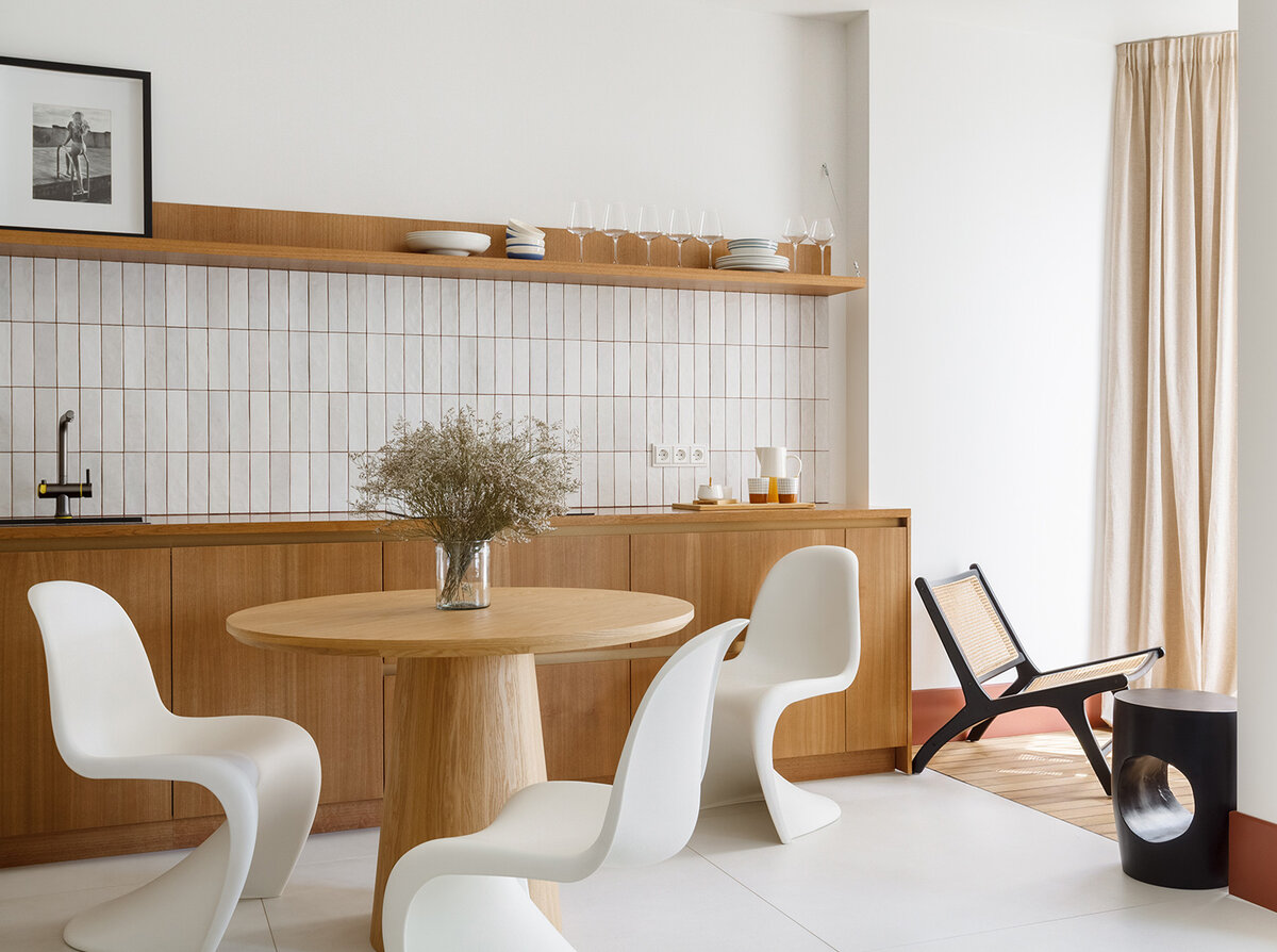Эту квартиру в Новороссийске дизайнер Екатерина Бекух из студии ADDAtelier оформила для себя, чтобы приезжать на выходные на море. Студия расположена в новом доме на берегу Цемесской бухты — незамерщающей северной части русского побережья Черного моря. «Интерьер я создавала для себя: изначальной идеей было сделать максимально белую квартиру — total white. — Рассказывает дизайнер. — Я сразу приобрела крупный по размеру керамогранит на пол под белый бетон и точно решила, что стены и потолок будут белыми. Но в процессе ремонта возникло желание сделать темную ванную комнату на контрасте с основным помещением, и это повлекло за собой появление высокого темно-терракотового плинтуса по всей квартире. Поэтому концепция total white трасформировалась в достаточно контрастный интерьер с акцентами черного и темно-терракотового цвета». Дизайнер провела перепланировку: присоединила балкон, благодаря чему в апартаментах появился красивый эркер с большими окнами и расширила холл, убрав небольшой участ