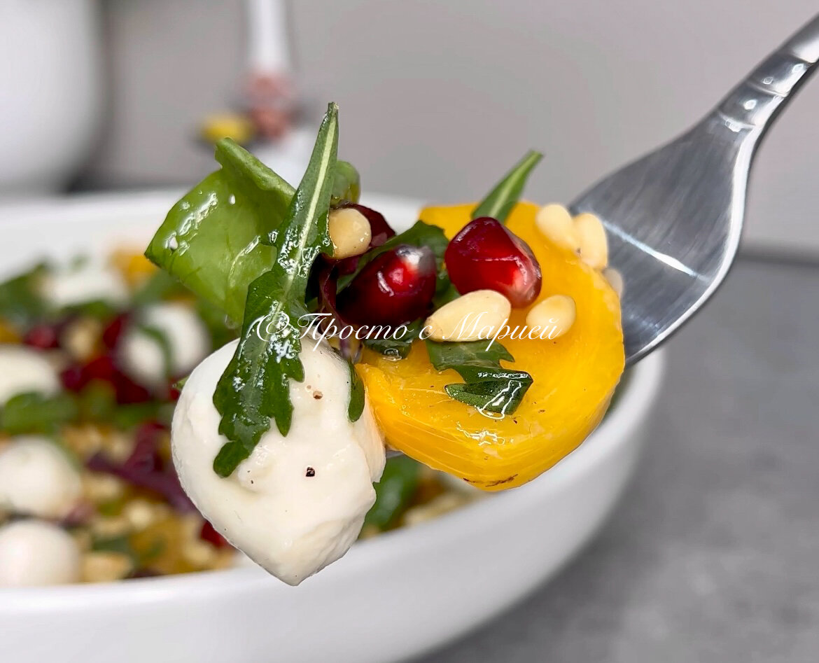 Минимум усилий, а какой нарядный результат! И всё это за 10 минут☝️ Привет, друзья! Вы на канале «Просто с Марией», и сегодня я хочу поделиться с вами простым рецептом изысканного салата к праздничному столу. Не стану писать бредни, что этот салат способен составить серьёзную конкуренцию оливье и прочей бессменной новогодней классике)) Нет, здесь совсем другая история: про буйство красок и взрыв вкусов, про то, когда хочется чего-то особенного… Сразу скажу, что сэкономить на продуктах здесь не получится, но ведь на то он и праздничный салат, верно? Приступаем к приготовлению. • Список ингредиентов и их количество можно посмотреть в первом комментарии в конце статьи Первым делом подготовим заправку. Удобно готовить её в какой-нибудь баночке небольшого объёма. Соединяем лимонный сок, мёд, масло, чёрный молотый перец, соль и интенсивно всё встряхиваем, чтобы получилась однородная эмульсия. Теперь берём подходящее блюдо и начинаем собирать салат. Первый слой — микс салатов. У меня зд