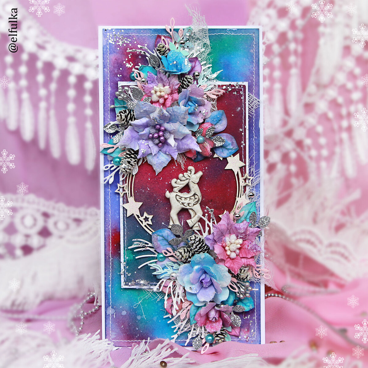 Доброго времени суток, мои творческие друзья и гости канала! Покажу вам открыточку, на создание которой меня вдохновило Северное Сияние✨ В нашем регионе это явление можно увидеть вживую)) Осенью у меня получилось запечатлеть на фото это волшебство. Ну, а теперь про саму открыточку. Представленная работа выполнена в яркой цветовой гамме: синий, фиолетовый, зеленый, розовый, бордовый и немного серебристых акцентов. Размер открытки 18 х13см Основа из дизайнерского картона белого цвета (плотность 200гр/м2). Фон сделан с нуля с помощью красок, чернил и имитирует сияние северного неба. Фоновые подложки дополнительно прошиты по контуру белой нитью. В центре представленной открытки звездная рамочка (чипборд), покрытая белым глиттером и сказочный олененок. Открытка оформлена морозными цветами. Каждый цветочек сделан и окрашен вручную. Тонировка цветов с акварельными переливами - очень красиво смотрится в данной работе. Дополнительно лепестки цветов покрыты хрустальным топпингом и глиттером (д
