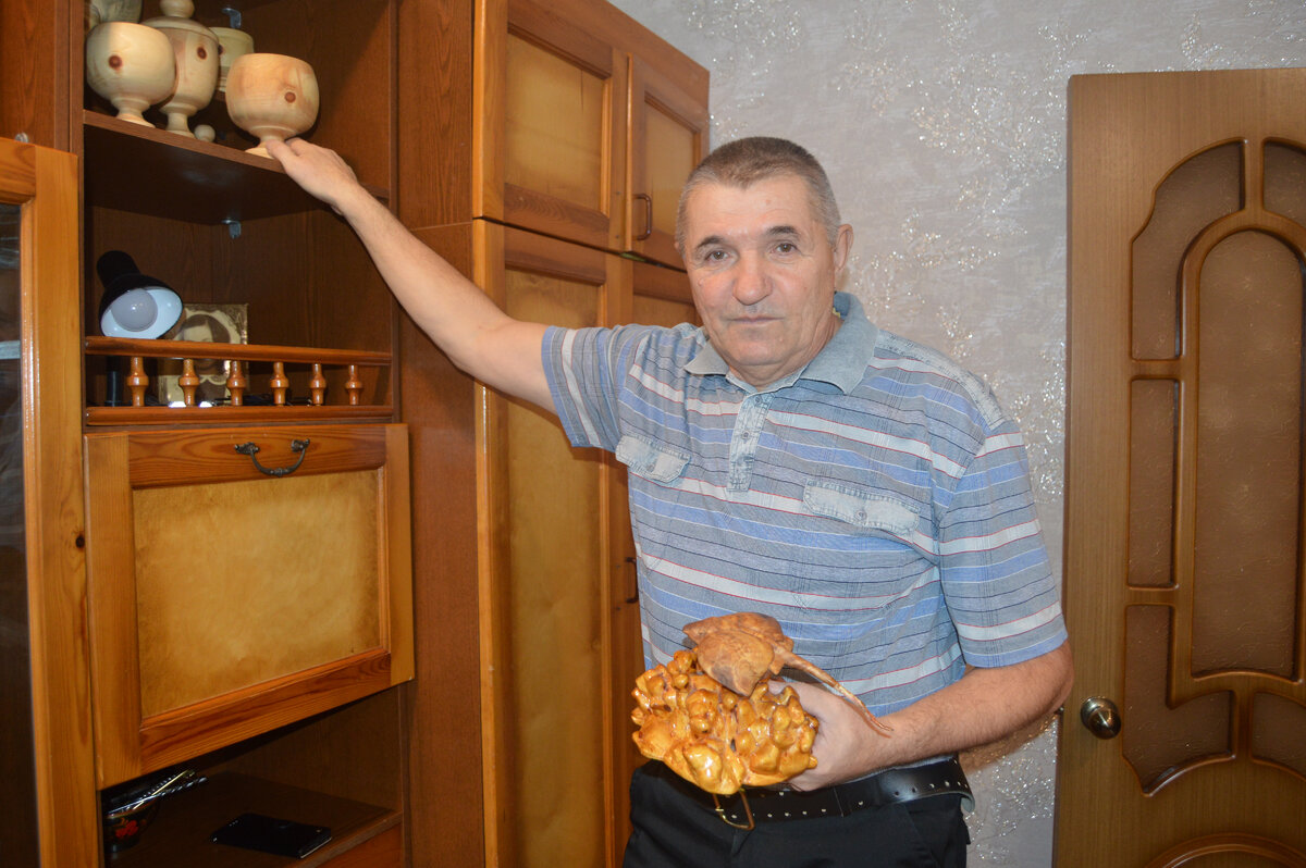 Сергей Иванович Старчуков из Селенгинска на пенсии совсем недавно. А без дела сидеть не привык. Человек он творческий. Одно из увлечений – резьба по дереву. Нравится ему работать с берёзовыми капами, наростами на деревьях. Берёшь в руки чашу из капа: гладкая, твёрдая, будто это не дерево, а кость. И трогать приятно. - Пробовал покрывать лаком – совсем не то, тепло уходит, — говорит мастер. — Кап лучше ничем не покрывать. Кап Сергею Ивановичу нравится уже тем, что сначала в лесу его надо отыскать. Поиск капов напоминает ему азартную грибную охоту. А когда нашёл, появляются другие нюансы. Кап может расти высоко, неудобно. Нарост охватывает дерево плотно. Сергей Иванович, чтобы не повредить берёзу, осторожно спиливает его «болгаркой». Когда с капа сняли кору, видно, какой он изнутри. Есть ли червоточины, повреждения. Ну а дальше самое интересное – увидеть в куске капа будущую деревянную скульптуру и убрать всё лишнее. Почти все свои работы мастер раздарил друзьям и знакомым. Дома остались