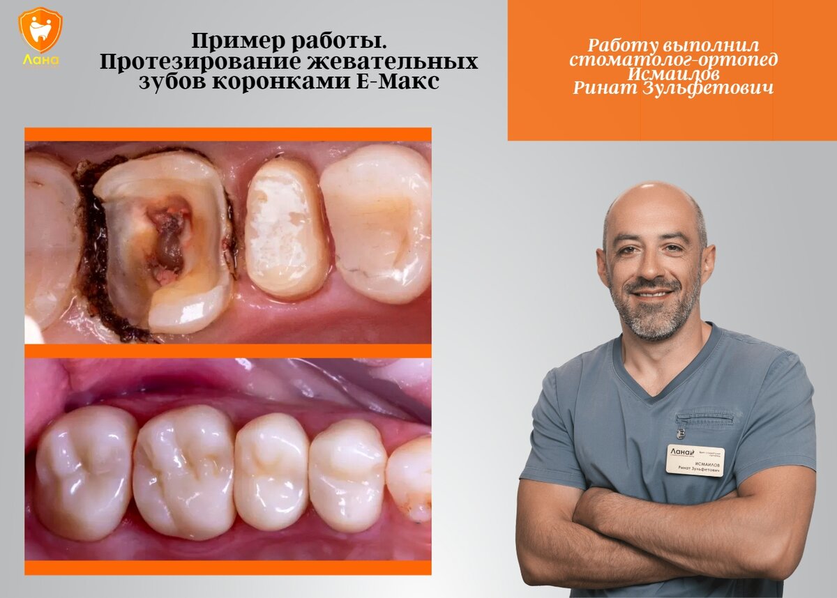 Сегодня хотим поделиться с Вами очередным успешным завершением лечения. Это один из самых любимых наших моментов видеть результат лечения. Сегодня расскажем о протезировании жевательных зубов при помощи коронок Е-Макс. Работу выполнил стоматолог-ортопед Исмаилов Ринат Зульфетович. К нам обратился пациент с сильно разрушенными жевательными зубами. После первичной консультации и изучения снимка КТ было принято решении о пролечивании каналов зубов и установки на них коронок Е-Макс, так как площадь разрушения зубов была довольно значительной. Коронки из безметалловой пресс-керамики по технологии E‑Макс — это передовая технология для решения разнообразных задач в современной эстетической стоматологии.