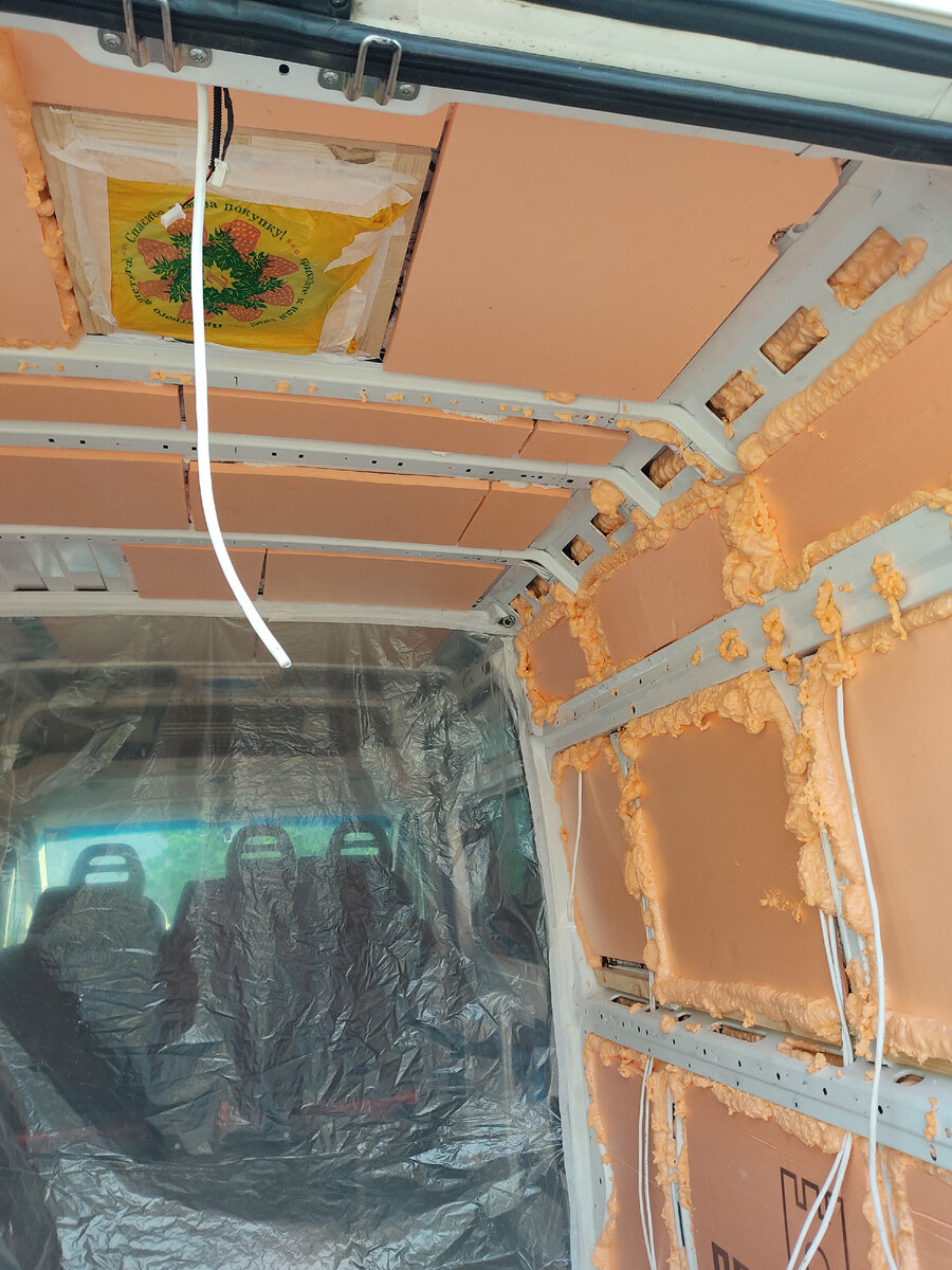 Вот начался процесс утепления))) Перед этим раскинул 100 метров провода 2х1,5 по ребрам жесткости, чем сделал большую ошибку (об этом напишу позже) и приступил к утеплению. Так как я высокого роста 187 см, то пришлось стены утеплять в два вида. Над будущим душевым блоком пока не утеплял. В скором времени из Нижнего Новгорода должна придти вытяжка накрышный грибок и тогда после выреза металла и установки утеплю вокруг неё.