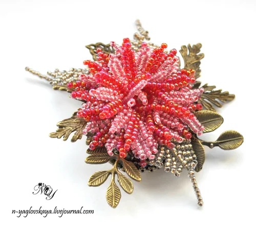 Добрейшего всем дня! Две недели назад был опубликован замечательный мастер-класс Наталии Ягловской (ник natyy) по созданию цветочной броши, в котором были показаны основные этапы работы. Неделю назад - мастер-класс по изготовлению центрального цветочка. А сегодня узнаем, как дополнить фурнитурные металлические листочки плетеными листьями папоротника, чтобы брошка получилась еще интереснее. Дальше - текст автора МК. Материалы и инструменты: Начинаем! 17. Продолжаем плести... Должно получиться: 21. Получилось: 22. Снова меняем рабочую нить. Оформляем кончик листика: 23. Повторим п. 20 для другой стороны листика. Готово! Изменяя количество бисеринок в "ворсинках" можно получить листья разной формы: Всем ровных крестиков, легких петелек и послушных бисеринок! #мастер класс #брошь из бисера #украшения своими руками #украшения ручной работы #бисероплетение #бисер