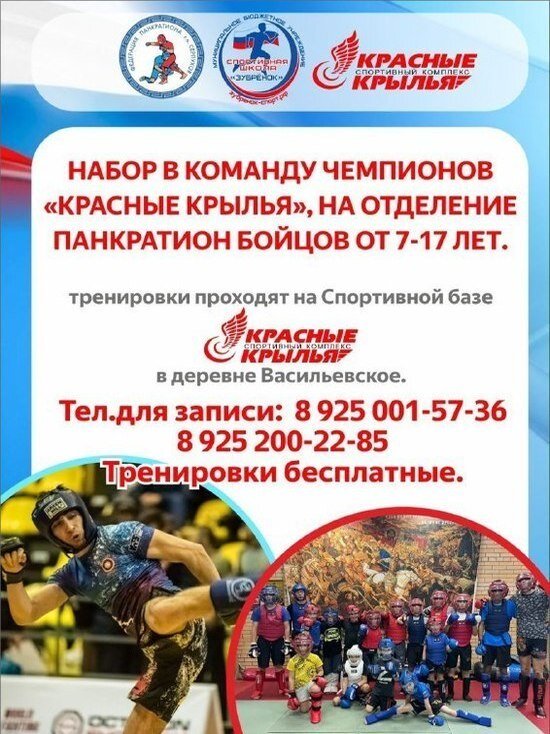 Занятия будут проходить на спортивной базе «Красные Крылья». Спортивная школа «Зубренок» и Федерация панкратиона г.о. Серпухов объявляют набор в команду чемпионов на отделение панкратиона. Занятия будут проходить на территории спортивной базы «Красные крылья» в деревне Васильевское. Тренировки бесплатные! Записаться в секцию панкратиона можно по телефонам: 8-925-001-57-36 и 8-925-200-22-85. Об одном из ведущих тренеров, президенте Федерации панкратиона г.о.Серпухов читайте в нашем материале. Автор: Полина Подольская