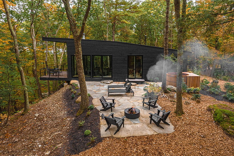 Расположенная на лесистом утесе конструкция, площадью 18,6 м.2, легко сочетает в себе деревенские материалы с брутальным и минималистичным интерьером. Для экстерьера используется черный окрашенный кедр с контрастными акцентами. Вместе эти элементы органично вписываются в лесистый ландшафт. Фасад в темных тонах дополняет обильное остекление, которое щедро открывает вид на улицу. Что касается интерьера: высокие потолки сочетаются с деревенской и приглушенной отделкой, что еще больше перекликается с лесным контекстом. Деревянные полы из необработанного белого дуба источают тепло и характер, в то время как керамогранитная плитка подчеркивает тему дерева в прихожей и ванной комнате. Кухня выглядит, как барная стойка, не теряя своей функциональности. Стеллажи из белого дуба уравновешивают дубовый шкаф в черном цвете, который прекрасно сочетается с металлизированной керамогранитной плиткой. Ванная комната "открытой планировки" излучает атмосферу лесного спа-салона.