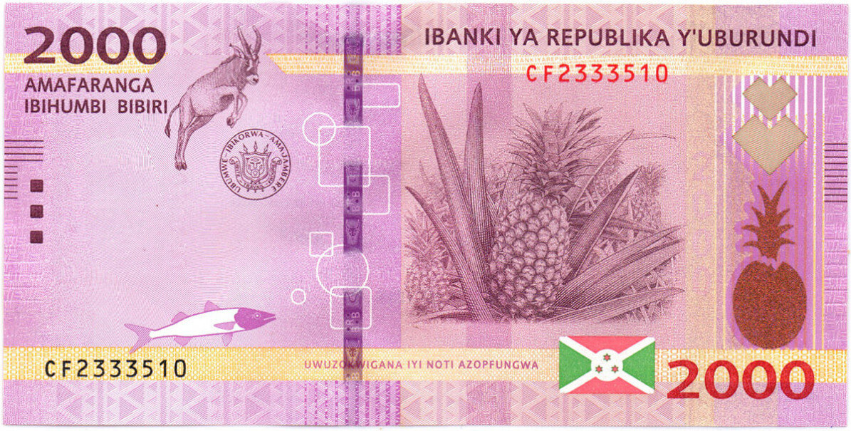 Размер: 132×66 мм. Цвет: фиолетовый и серо-коричневый. Средства защиты: водяной знак с аббревиатурой BRB и портретом Луиса Рвагасора (1932—1961), нить безопасности и волокна видимые в ультрафиолетовых лучах. В левом верхнем углу указан номинал цифрами (2000) и прописью на языке рунди (Amafaranga Igihumbi Bibiri). Под ним находятся элементы для слабовидящих людей. С права находится изображение антилопы большой куду (Tragelaphus strepsiceros), рядом с которой изображен государственный герб Бурунди (щит со львом и с тремя копьями; под щитом на ленте, на французском на писан девиз Бурунди: Unité, Travail, Progrès (единство, работа, прогресс) он же, только на языке рунди, повторяется вокруг герба Ubumwe - Ibikorwa - Amajambere). Ниже находится схематичное изображение рыбы в качестве защитного средство. Она повторяется на оборотной стороне , только другим цветом. Правее геометрические узоры и ныряющая защитная нить с изображение головы коровы и аббревиатурой BRB. В правом верхнем углу указан банк-эмитент Ibanki Ya Republika Y’uburundi (Банк Республики Бурунди). В левом нижнем углу, на желтом фоне - серийный номер банкноты, повторяющийся под названием банка красным цветом. Снизу по центру - предупреждение для фальшивомонетчиков (Uwuzo Wingana Iyi Noti Azopfungwa). Справа государственный флаг Бурунди и номинал красными цифрами (2000). Центральную часть банкноты занимает изображение ананаса (Ananas comosus). В Бурунди экономика основана на выращивании культур, ежегодно производится 7500 тонн ананасов. Он же в стилизованном виде расположен рядом с цифрами номинала.