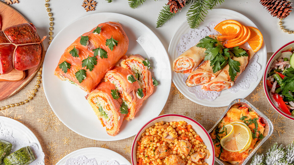Делимся лайфхаком, как собрать вкусный и красивый праздничный стол и не свалиться от усталости в 23:45 31 декабря. Несмотря на то, что последний день 2022 года выпадает на субботу, очень не хочется тратить его на готовку. Ведь намного радостнее будет выспаться, спокойно позавтракать, поиграть с детьми или идти поздравлять родителей и друзей. А что же новогоднее меню – салаты, закуски, десерты? Об этом мы уже подумали. Новогоднее меню из новинок собственного производства Макси – это вкусно, красиво и бережёт ваше время. Приходите за свежими аппетитными салатами Для любителей сытных блюд – салат «Полянка» со свининой, картофелем и жареными шампиньонами. Салат «Восточные мотивы» удивит интересным сочетанием буженины «по-домашнему» с овощами и бобовыми. Настоящим украшением стола станут салат-рулет «Зазеркалье» из сёмги и тигровые креветки с овощами в соусе. Присмотритесь к закускам в новогоднем оформлении Гости точно оценят шпинатный рулет с лососем и закуску «Новогодняя игрушка», а кабач