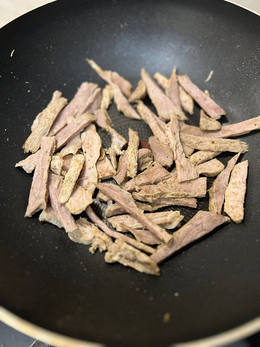 После варки режем говядину брусочками и отправляем на сильно разогретую сковородку. Запечатываем мясо 2-3 минуты и убавляем огонь.