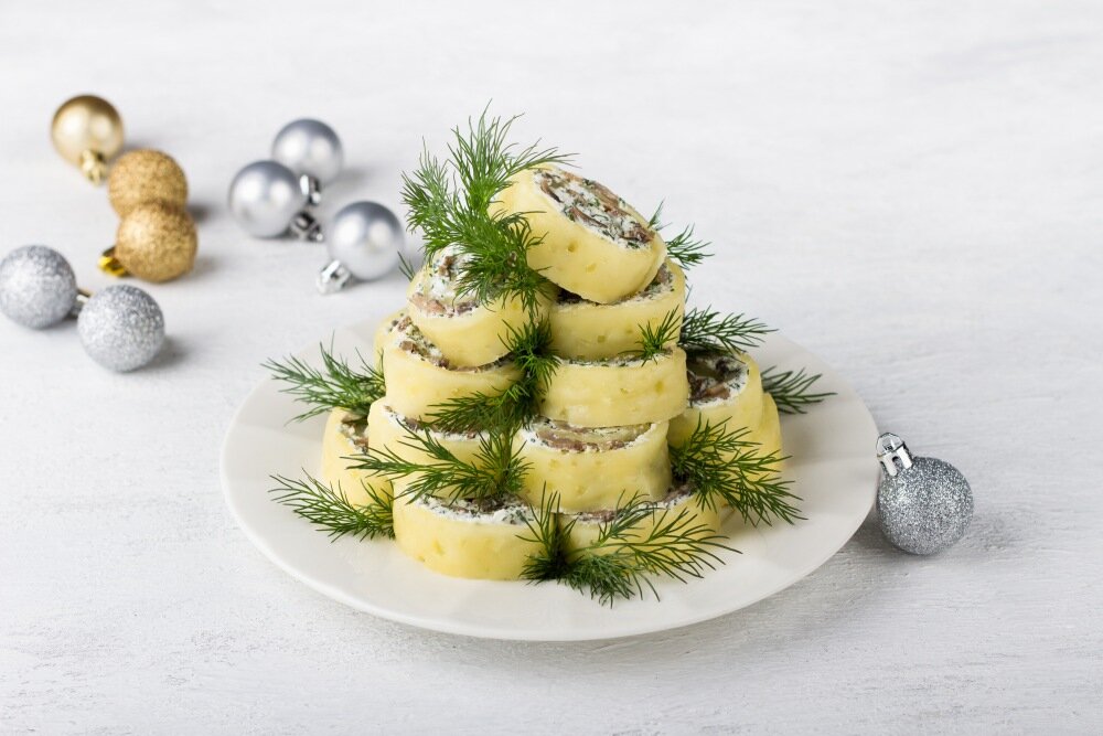 Этот рулет с начинкой для новогоднего стола оценят любители сыра. Основа рулета - расплавленный тёртый сыр, а начинка состоит из творожного сыра с зеленью и грибами. При этом начинка может быть любой: любимая грибная икра или паштет, картофельное пюре с зеленью или грибами, различные сочетания с творожным сыром и т.д. Технология приготовления очень простая и достаточно быстрая, что особенно важно в период Новогодних праздников. Да и приготовить его можно накануне, а 31 декабря останется только нарезать сырный рулет на порции и украсить по вкусу. Если сделать из сырных рулетиков фантазийную ёлочку, то она станет украшением праздничного стола. Ингредиенты: Приготовление: Шаг 1 Подготовить все ингредиенты для сырного рулета с начинкой на Новый год. Для рецепта нужно взять твёрдый (или полутвёрдый) сыр, который хорошо плавится. Можно использовать смесь разных сыров. Это будет сырная основа. Грибы можно взять любые: шампиньоны, вешенки, лесные грибы, в том числе, замороженные. Выбирайте кач