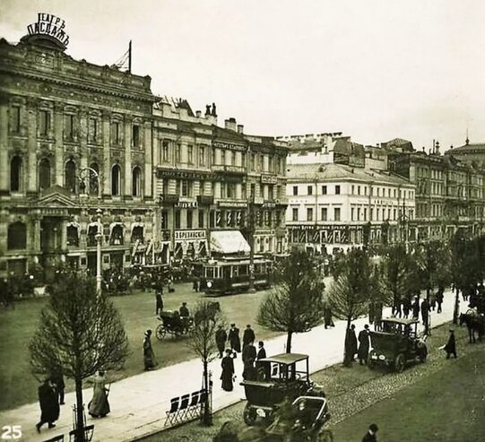 Здравствуйте, дорогие читатели! Сегодня среда и поэтому мы с вами по традиции отправляемся на 100 и более лет назад и гуляем по Петербургу того времени. В прошлую среду мы с вами остановились возле здания Пассажа – от него и отправляемся. Напоминаю, что все фотографии встроены в галереи, где первое фото черно-белое, а следующее – окрашенное. 1. Напротив Пассажа возле Гостиного двора в начале 20 века уже можно было увидеть первые таксомоторы – машины справа, – которыми в основном были американские «Ford» и европейские «Opel» и «Charron». В то время деятельность всех городских такси ограничивалась одним лишь объединением «Санкт-Петербургский таксомотор». Кстати, максимально разрешенной скоростью для машин того времени было всего 12 километров в час. Думаю, эта мера, как и отсутствие велосипедистов на улицах города, была принята для того, чтобы не пугать лошадей. 2. Посмотрим на жизнь – что происходит вокруг, чем заняты люди. Империал (второй этаж конки) заполнен полностью, в то время ка
