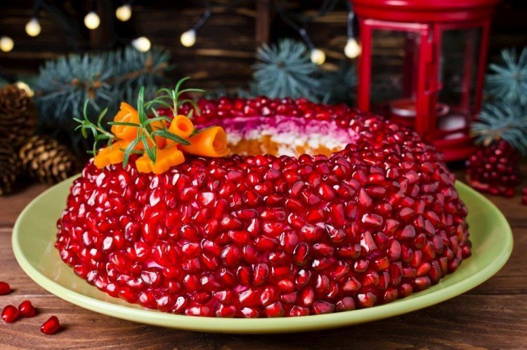 Надоели оливье и мимоза? Приготовь слоеный салат «Гранатовый браслет»! Нарядный салат с замечательным названием “Гранатовый браслет" давно завоевал заслуженную популярность и входит в топ самых популярных салатов для праздничного стола. Красота и отличный вкус салата покорят всех ваших гостей. Салат Гранатовый браслет с курицей классический украсит любой стол, даже станет главным блюдом на нем - настолько он красиво смотрится. И готовить его одно удовольствие, просто, довольно быстро. Украшению нужно уделить время, а остальное без проблем. Ингредиенты для блюда Свекла- 300гр. Куриное филе-250гр. Грецкие орехи- 60гр. Яйца- 3шт. Картошка- 2шт. Морковь- 1шт. Майонез- 100гр. Гранат- 1шт. Время приготовления- 3ч. Майонез лучше приготовить самостоятельно. Будет вкуснее и полезнее.