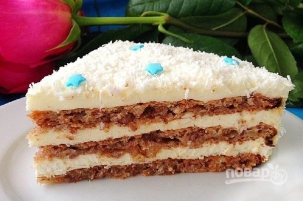 Невероятно нежный, мягкий торт с чудесным сливочным кремом, ореховыми коржами и кокосовой стружкой. Что может быть вкуснее? Смотрите, как приготовить торт "Морозный вечер". Описание приготовления: Изумительно вкусный, аппетитный! Именно так можно сказать о торте, который очень-очень хочется попробовать. Не отказывайте себе в удовольствии, не сдерживайте своих желаний, отведайте тортик. Порадуйте себя и своих близких этим замечательным десертом! Ингредиенты: Взбейте белки до устойчивых пиков. Добавьте постепенно 200 грамм сахара и ванильный сахар. Орехи перемелите в муку, добавьте их в белковую массу порциями, аккуратно перемешивая снизу вверх.На пергамент выложите треть массы и разровняйте. Для удобства можно нарисовать круг на пергаменте по размеру чуть меньше вашей формы. Выпекайте при температуре 170 градусов 20-25 минут. Для крема молоко доведите до кипения, немного остудите. Желатин замочите в небольшом количестве воды. Желтки смешайте с крахмалом и сахаром. Введите желтки в г
