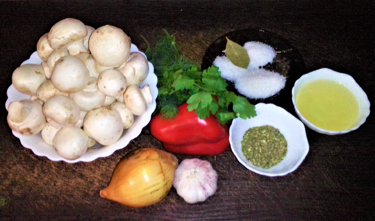 Их не нужно консервировать. Уже на следующий день грибочки готовы! Для приготовления мне нужно: Для маринада: Свежие шампиньоны почистила и промыла под холодной проточной водой. Затем 5 минут отварила в подсоленной воде. Отваренные грибы откинула на дуршлаг. Подготовила маринад Довела до кипения 1 литр воды. Добавила лавровый лист, черный перец и майоран. Проварила 2-3 минуты. Сняла с огня. Добавила уксус, оливковое масло, соль. Болгарский перец нарезала кубиками. Нарезала лук. Мелко нарезала зелень, чеснок нарезала слайсами. Грибы порезала пополам, если они крупные, а мелкие - целиком. Уложила их в глубокую посуду (можно баночку или контейнер). Высыпала кубики перца, зелень, измельченный лук и чеснок поверх грибов. Залила горячим маринадом. Закрыла крышкой и оставила остужаться. Как только грибы остыли - поставила в холодильник на 12 часов. Все, грибочки готовы, можно угощаться. Если вам понравился рецепт, ставьте в