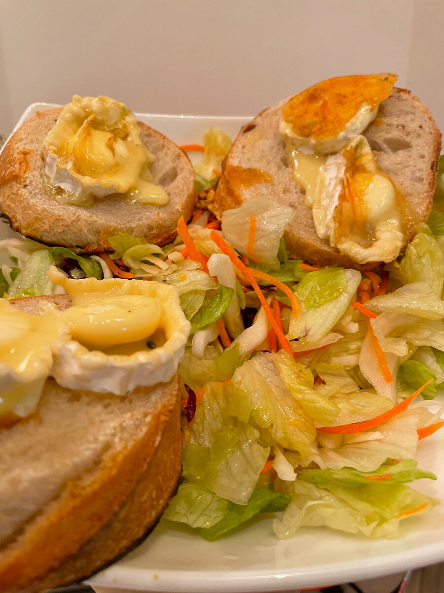 Этот салат запал мне в душу с первого взгляда. Одно название чего стоит - de Chèvre Chaud. Козий сыр, гренки они же крутоны, что может быть лучше, да и готовится он очень быстро. Ингредиенты: Большой пучок зелени любой на ваш вкус. Хлеб. Для аутентичности конечно лучше багет. Количество зависит вашего аппетита. Козий сыр. Во Франции есть специальный для этого салата, а у нас какой найдете. Мед опционально. Для заправки: Винный уксус Растительное масло Можно добавить специи на ваш вкус (прованские травы, например) Процесс: 1. Все ингредиенты необходимые для заправки перемешиваем 2. Зелень кладем в тарелку, поливаем заправкой, можно чуть-чуть помять руками 3. Хлеб и сыр обжариваем на сковороде или для простоты под грилем в духовке 4. Багет с сыром выкладываем на тарелку, можно полить медом Готово.
