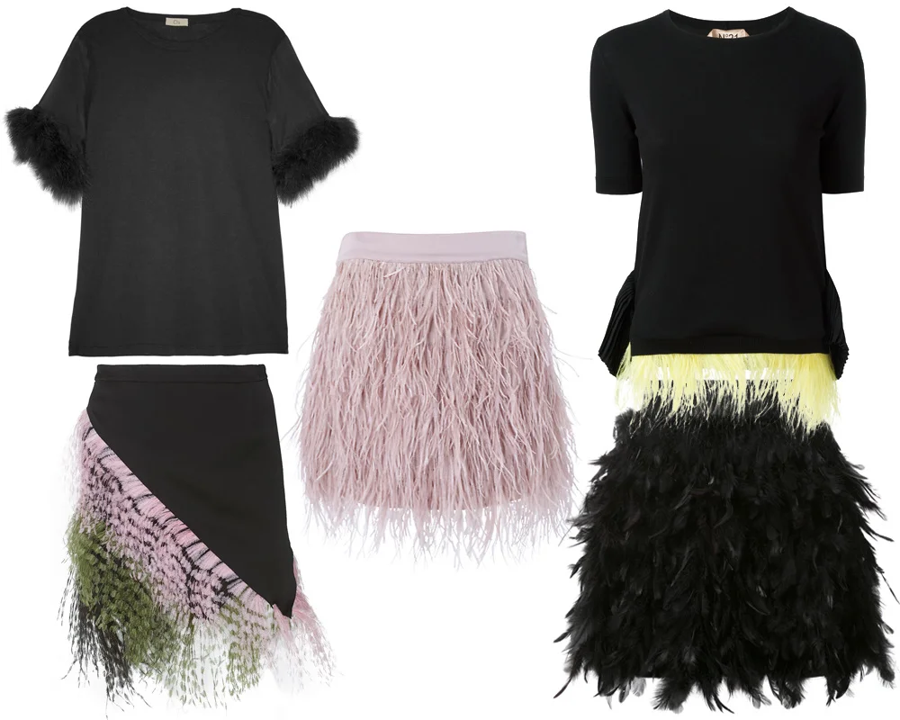 Когда речь заходит об анималистичных узорах, в голове сразу же возникает пресловутый леопард, зебра, ну и, возможно, тигриная полоска. Меж тем, в моде вот уже не первый сезон популярны более смелые вещи: юбки, похожие на русалочьи хвосты, брюки под питона самых ярких цветов, а также многочисленные топы и платья, декорированные перьями. Оторочка перьями Вещи, украшенные перьями, могут стать отличной базой как для повседневного гардероба, так и для особого случая. Топы из шелка с декором на груди, юбки с аккуратной оторочкой или жакет с пышным «оперением» на рукавах – вариантов очень много. А если затея облачиться в перья с ног до головы кажется вам слишком смелой, попробуйте сделать акцент на чем-то одном: например, выберите футболку нейтрального цвета и скомбинируйте ее с простым, но декорированным низом. К такому образу подойдут классические лодочки или кроссовки. Чешуя Красиво мерцающих платьев и юбок в этом сезоне немало: мелкие золотистые и серебряные пайетки прекрасно имитируют че