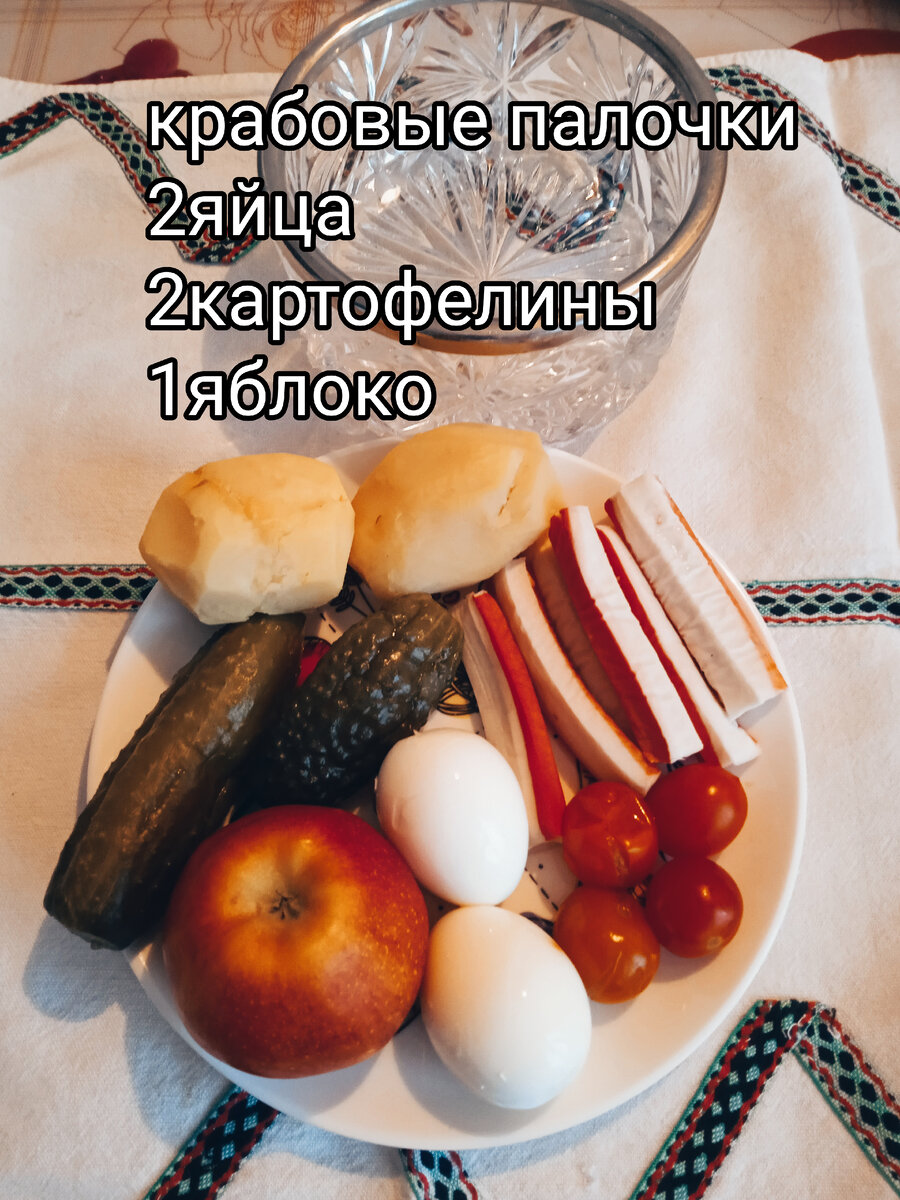 Простой салатик из доступных продуктов. Они у каждого есть в холодильнике. Нам понадобятся: Крабовые палочки 100 гр. 2 картофелины 2 яйца варёных вкрутую 1 яблоко 2соленых огурчика Соль по вкусу Майонез или сметана. Для зправкиможно майонез или сметану. А можно 50/50. Все прдукты режем кубиком. Складываем в салатник, можно слоями. Затем заправляем по вашему вкусу. У меня майонез сметанный. Салат готов. Приятного аппетита . Все фото автора. Подписывайтесь на мой вкусный канал. Жду подписчиков и гостей. Всем рада.