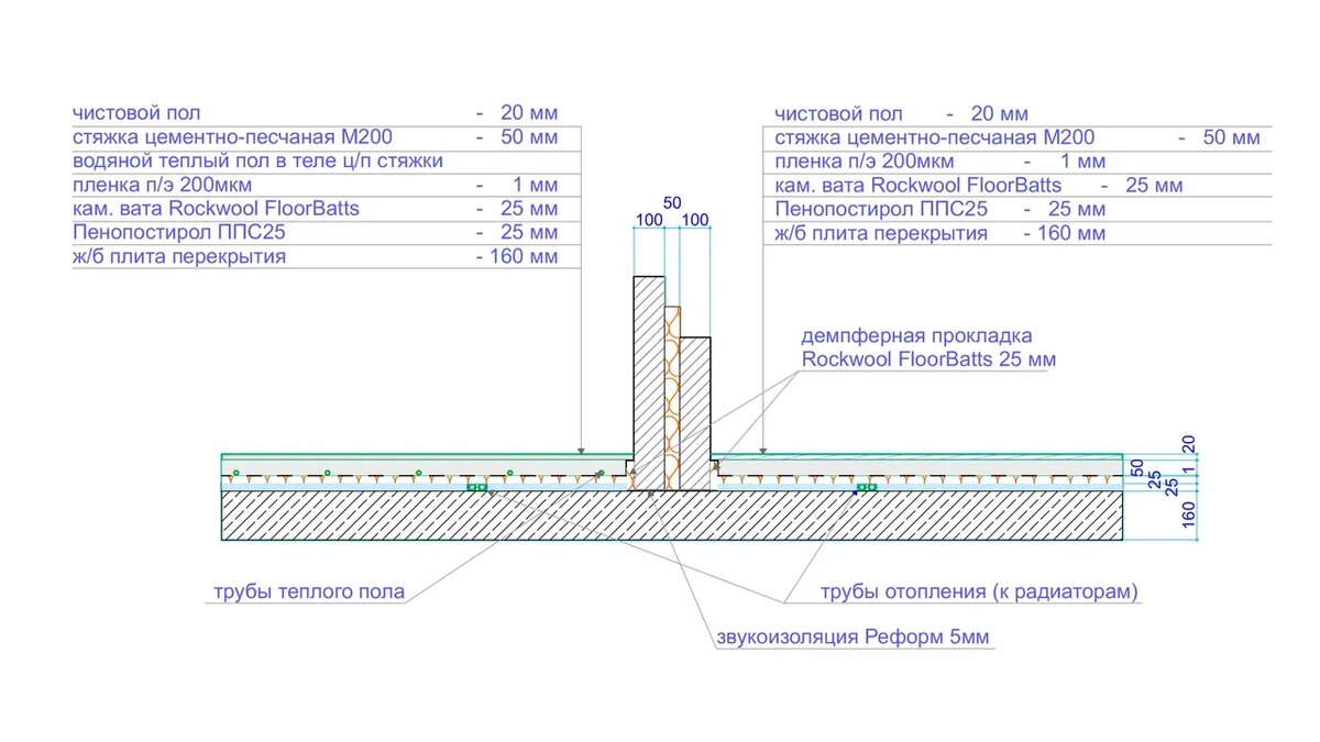 Повышенная шумоизоляция в квартирах нового поколения реализуется за счет: 1) На ж/б плиту сначала укладывается полистирол толщиной 25 мм, он гасит вибрации между этажами. 2) Следующий слой - каменная вата RockWool FloorBatts, имеет огнезащитные и звукоизоляционные свойства - 25 мм 3) Третий слой стяжка цементно-песчаная - 50 мм. 4) Чтобы на стыке полов и стен также приглушались звуки и вибрация, под под каждую стеновую перегородку укладывается специальная пленка ТехноЭластАкустик, и стена еще обкладывается элементом из каменной ваты RockWool FloorBatts 5) Последний слой - чистовое покрытие, которое выбирает хозяин квартиры 6) Кроме того, стеновой материал тоберморит также имеет звукоизоляционные свойства Такая степень шумоизоляции позволяет снизить шумовое загрязнение до 60 дБ. Если в квартире танцы и музыка до 90дБ, то у соседей сохраняется комфортная шумовая обстановка ежедневного стандартного уровня в допустимых пределах 45дБ Подробнее о материале стен нового поколения тобермарит